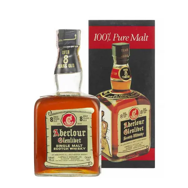 Cette version officielle d’Aberlour 8 ans fut lancée sur le marché italien au cours des années 70 ; un marché particulièrement dynamique pour les single malts. Mis en bouteille (75cl) à 50% par ses propriétaires d’alors, la société Campbell’s Distillery Ltd, société rachetée par le groupe Pernod Ricard au même moment, cette jeune version témoignait de la maturité précoce des malts vieillis en fûts de sherry de cette époque.