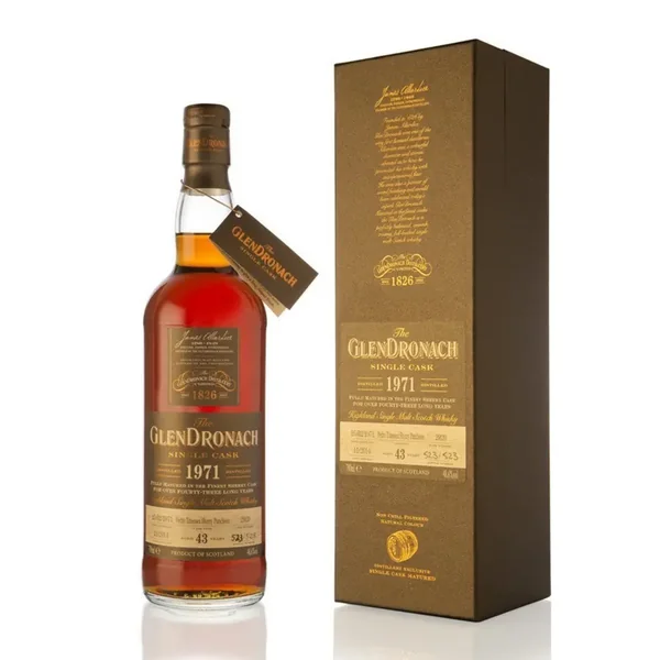 Vieilli 42 ans dans un fût (le numéro 1246) de xérès pedro ximenez, Glendronach 1971 est un single malt profond et concentré. Marqué au nez par des notes de cuir, de sirop de prune, d’herbes, la bouche dévoile le clou de girofle, la cannelle, la fève de café, les fruits noirs et des vagues d’eucalyptus. Un grand whisky.