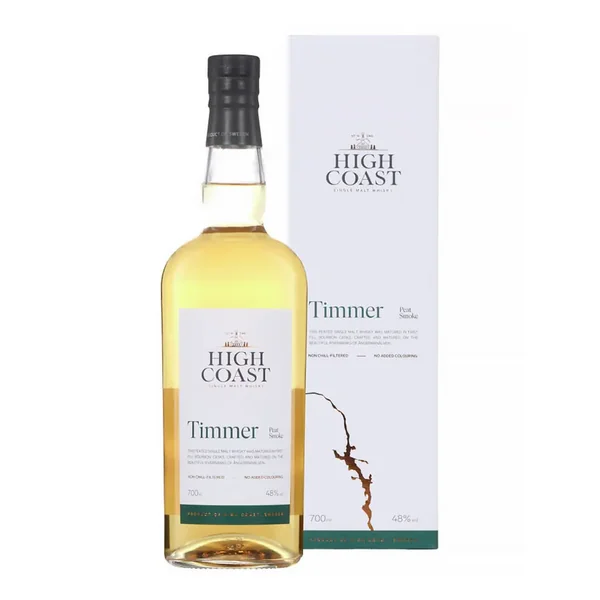 High Coast Distillery, située dans le Nord de la Suède à Bjärtrå, est une distillerie atypique qui produit exclusivement des whiskies Single Malt. Probablement l’une des plus proches du cercle arctique, 63° Nord, High Coast distille des Single Malt de caractère qui se démarquent par leur finesse aromatique. Les conditions climatiques de la région, -30° en hiver et +30° en été, apportent un style unique et authentique à ces whiskies. Fondée en 2010, la distillerie continue son développement et pense à l’avenir : plus de 10.000 fûts sont immobilisés pour le vieillissement de leur Single Malt. À terme une gamme complète de compte d’âge sera proposée. Timmer – qui signifie « bois » en suédois – est un single malt suédois fortement tourbé, élaboré à partir d’orge maltée de Belgique. Mûri dans une combinaison de fûts de bourbon de premier remplissage et de quarts de fûts ex-bourbon de remplissage, Timmer a des arômes fumés et herbacés de fenouil, de basilic et de citronnelle. La bouche offre des notes d’herbe fraîchement coupée, d’herbes de jardin et d’agrumes vifs, équilibrées par une riche fumée, du gingembre frais et du poivre noir, et juste un soupçon d’air marin salé.